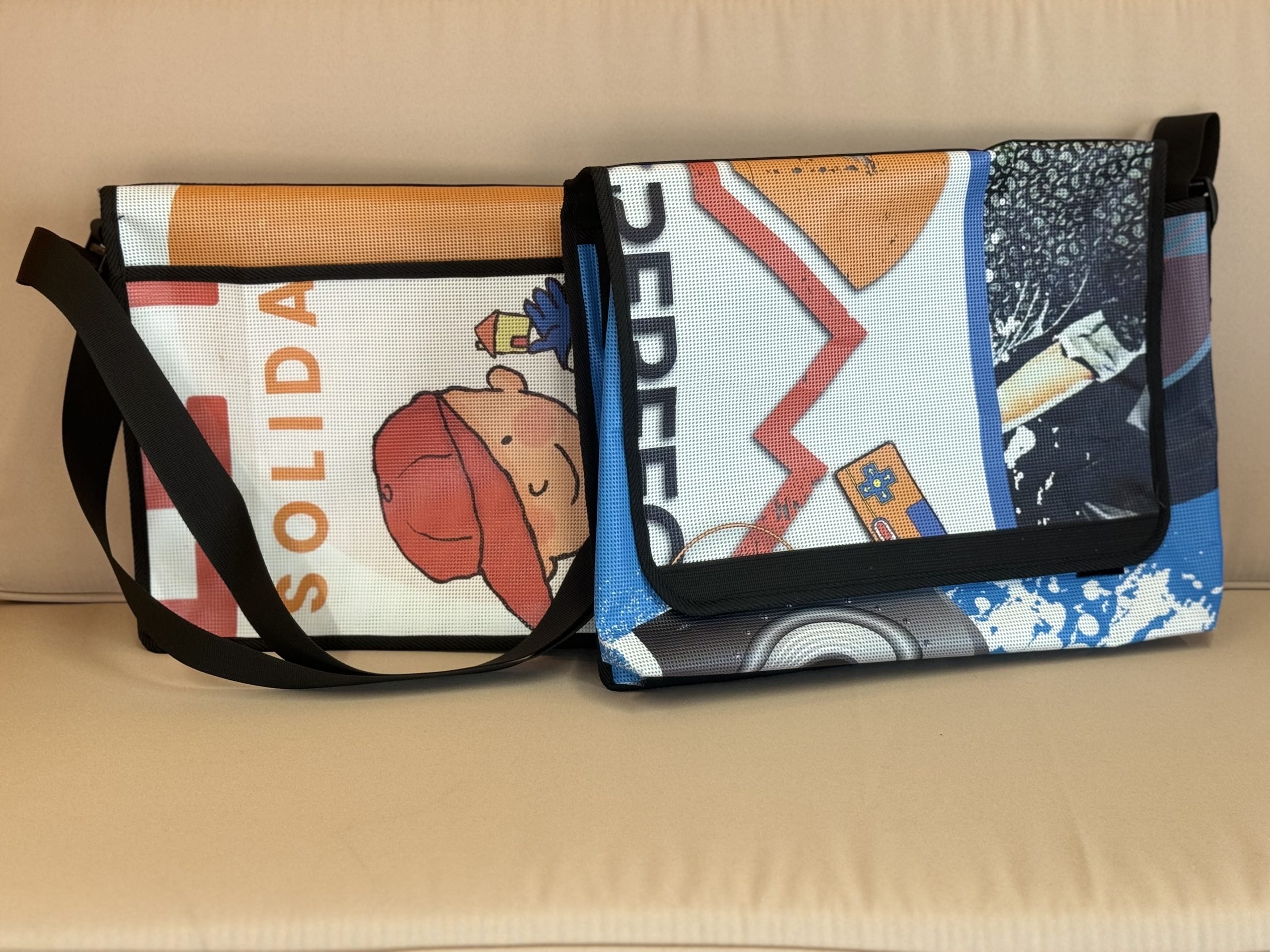 Bolsa bandolera edición especial TransPerfect Mountain Challenge y TransPerfect Music Remember Fest 2024. Hecha en Barcelona por la empresa local Demano con material reciclado de las pancartas del evento. Modelo Universitat con forro y bolsillo interior. Cada pieza es única, no dejes pasar la oportunidad y consigue una de las 25 disponibles.
